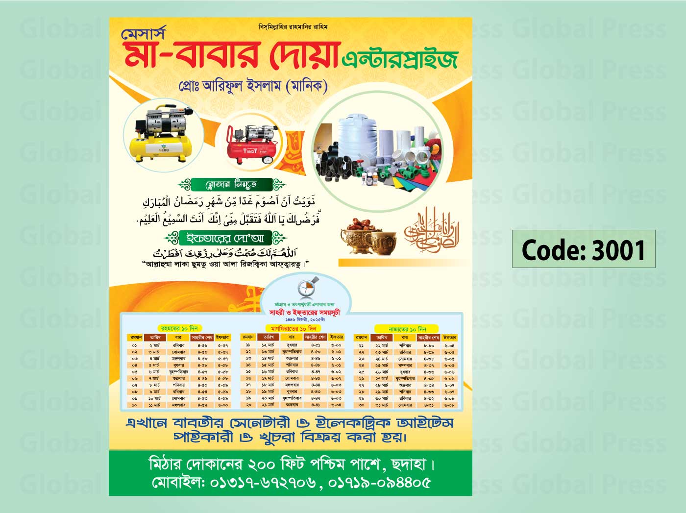 রমজান মাসের সেহরি ও ইফতারের সময়সূচি সম্বলিত সুন্দর, ইসলামিক ও প্রিন্ট-রেডি লিফলেট ডিজাইন সার্ভিস।